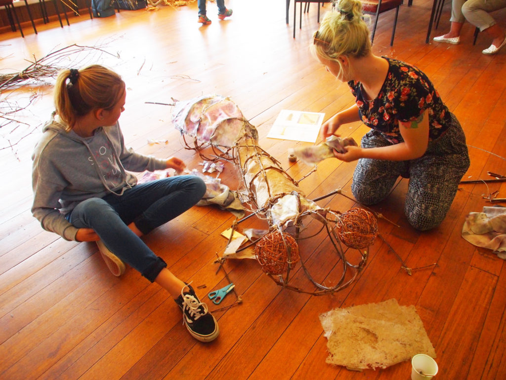 Local school students took water samples from the river and identified the water bugs as part of their science program, and then gave this information to the artists. They worked together to design and create the water bug installations, using a combination of basket weaving techniques with local sourced materials, eco dyed fabrics and other sustainable resources that are native in the community. 70 local community members also engaged in workshops to learn more about the importance of river-care and help to create the sculptures.
