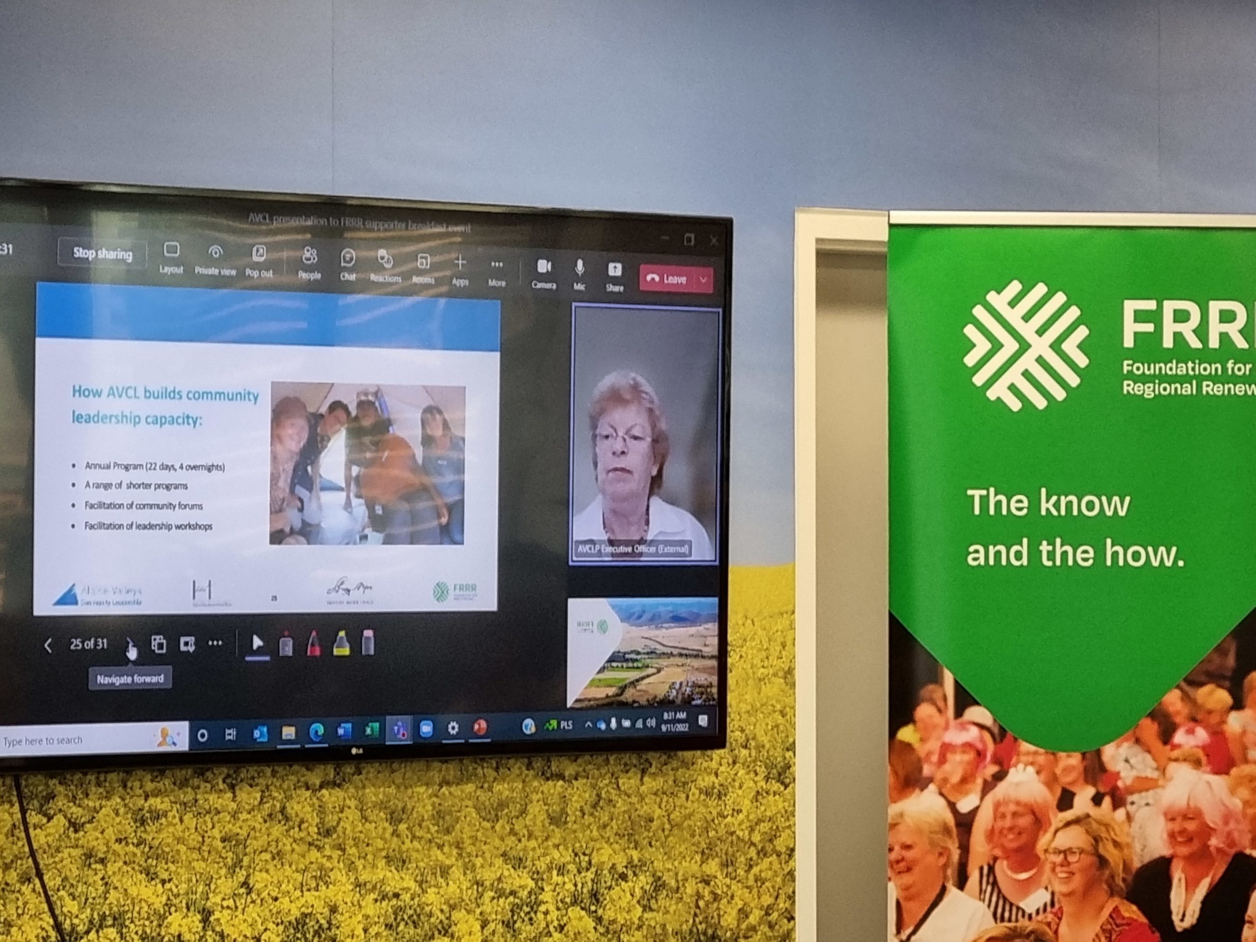 In November, around 25 supporters joined the FRRR directors, CEO and Partnerships Team for a donor event held at the Nutrien Ag Solutions offices in Docklands, Melbourne. Dialling into the event as a guest speaker was Jacqui Bramwell from Alpine Valleys Community Leadership (AVCL) program.