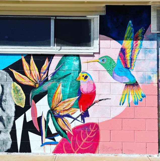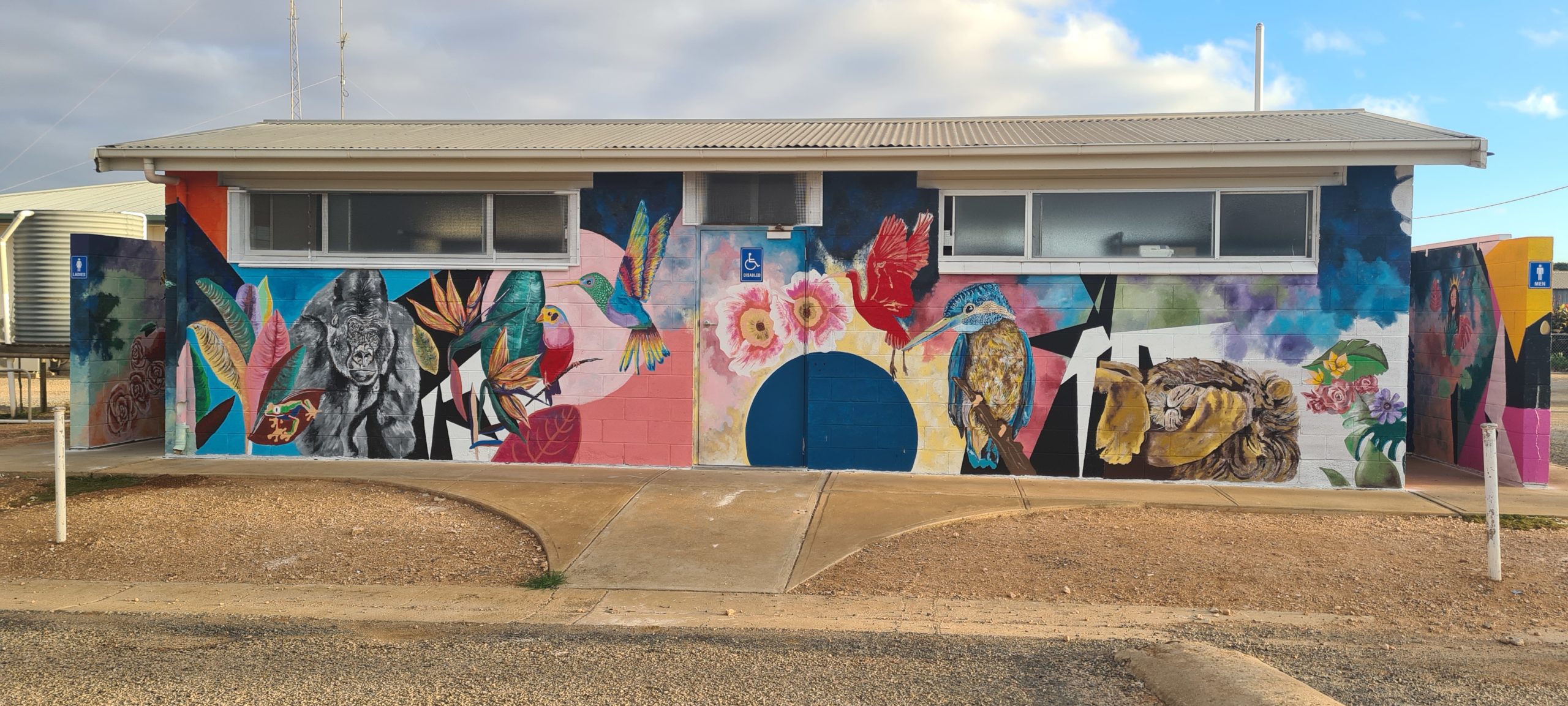 The mural has transformed the dull façade of the Centenary Park amenities block with vibrant images of bird and animal life. It is now regularly admired by locals and visitors to Centenary Park. With animals and objects of every letter of the alphabet to find and discover, it’s great for people of all ages, from young children looking for animals, teenagers posing for photos and adults enjoying the beautiful artwork. This mural is bright and colourful and a wonderful sight for tourists calling in off the highway and visitors to the region.