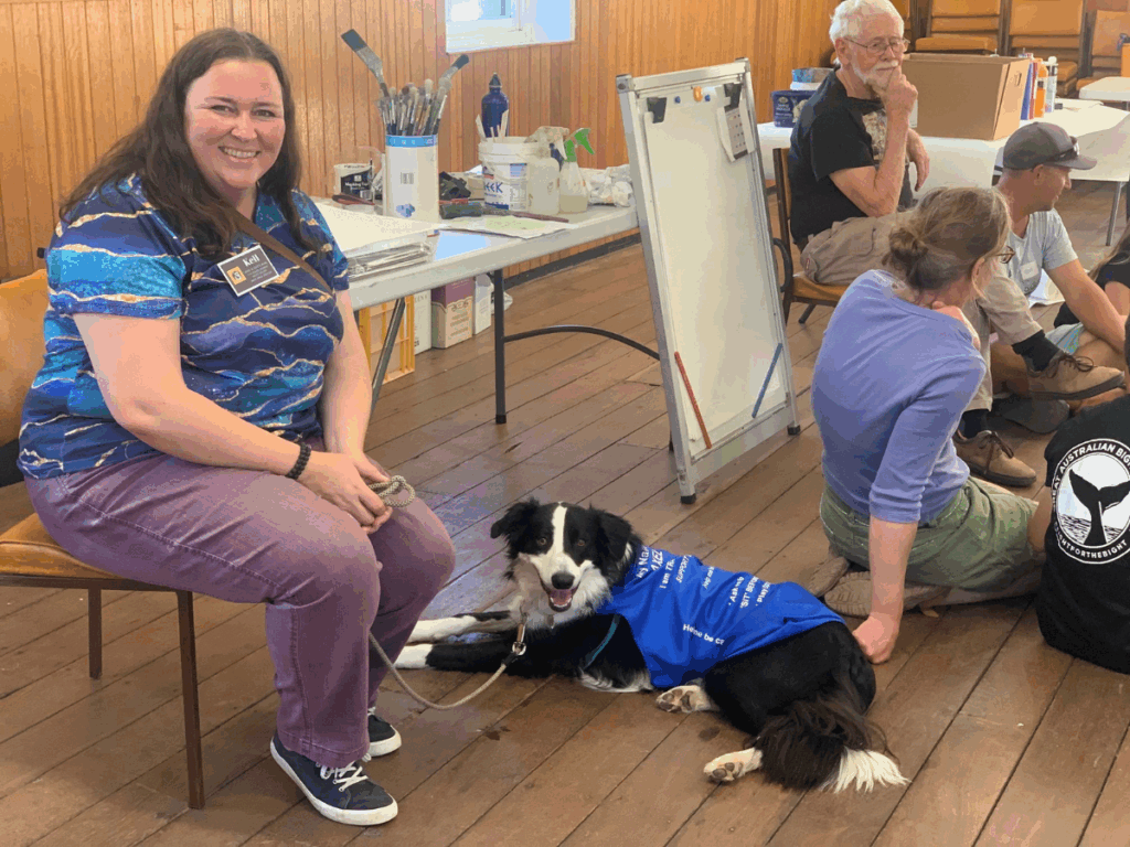What made the sessions unique was their deliberate, wrap-around support. Each was co-facilitated by Evette Wolf, Project Manager and Workshop Leader, local psychologist Gosia Morse and Kell Burgess, workshop assistant and dog handler – with Axel the support dog providing calm and comfort. Gosia’s guided wellbeing games opened each session and were thoughtfully designed to help participants connect, build self-esteem and feel safe.