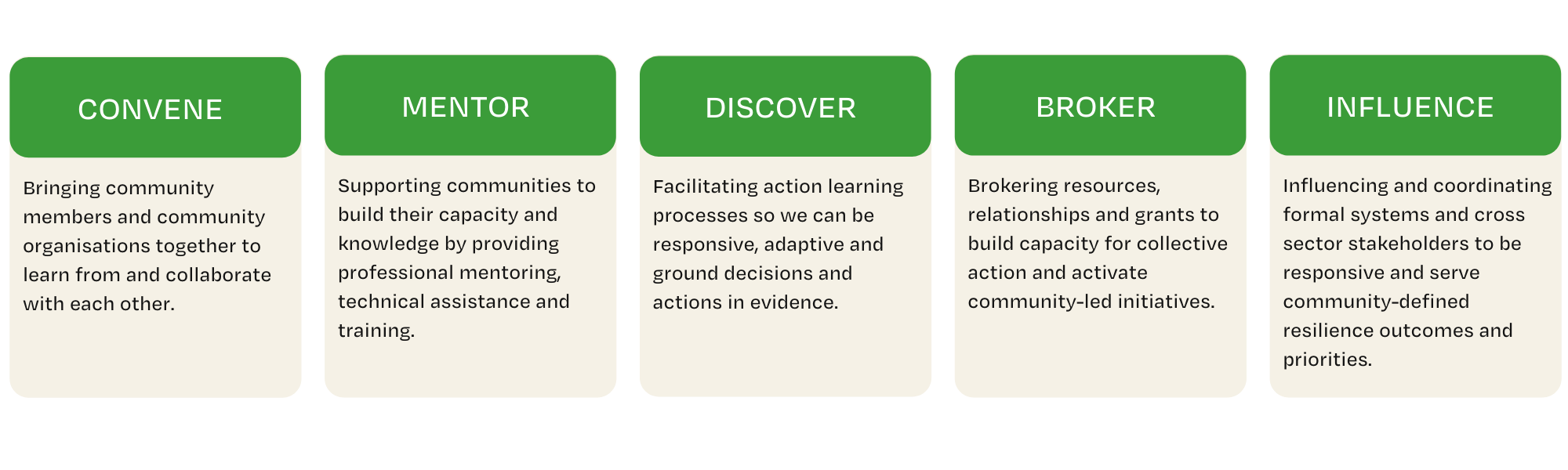 - Community Resilience: We work alongside people and communities to build on assets and catalyse leadership, collaboration and collective action that strengthens social capital and builds community resilience.