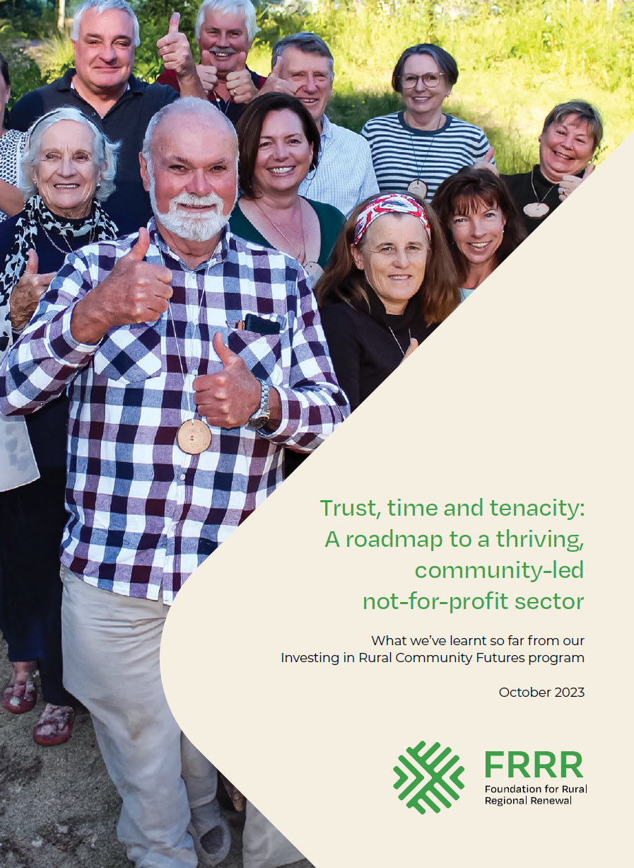This report captures the learnings and insights of the Investing in Rural Community Futures (IRCF) program to date. Over the past five years IRCF has worked alongside the not-for-profit sectors and it’s leaders in eight rural communities, co-designing and supporting capacity building initiatives across four pillars of People, Systems, Strategy, and Efficiencies. Focusing on an approach grounded in the key elements of trust, time and tenacity, the report shares both quantitative and qualitative outcomes so far, along with highlighting emerging areas of longer term impact as communities have come together to collaboratively navigate local challenges and develop sustainable strategies for the future. Download the report or click below to view online.